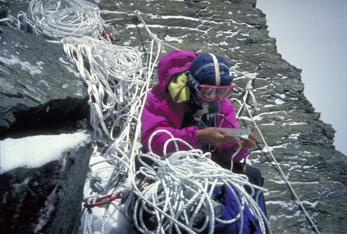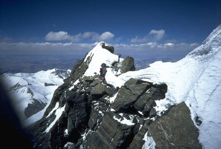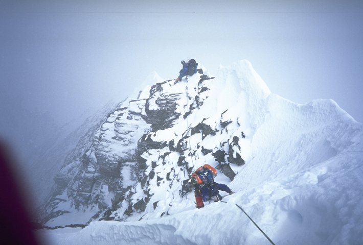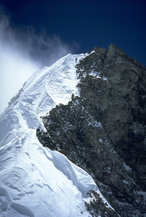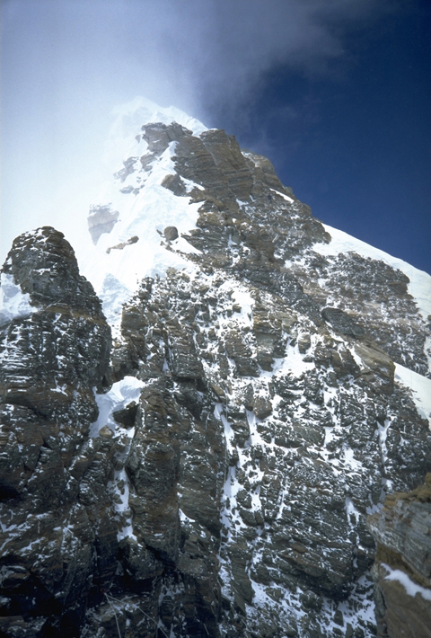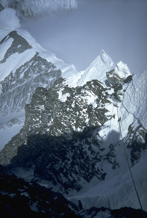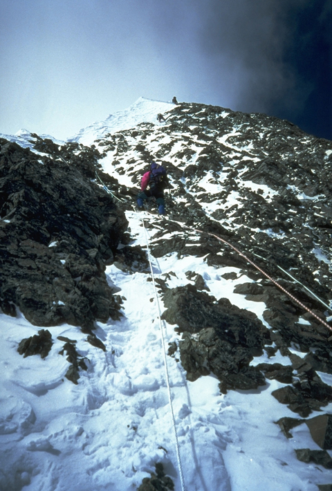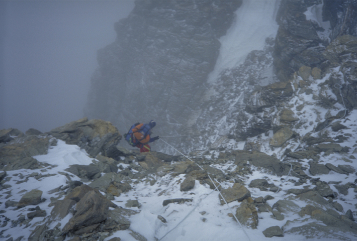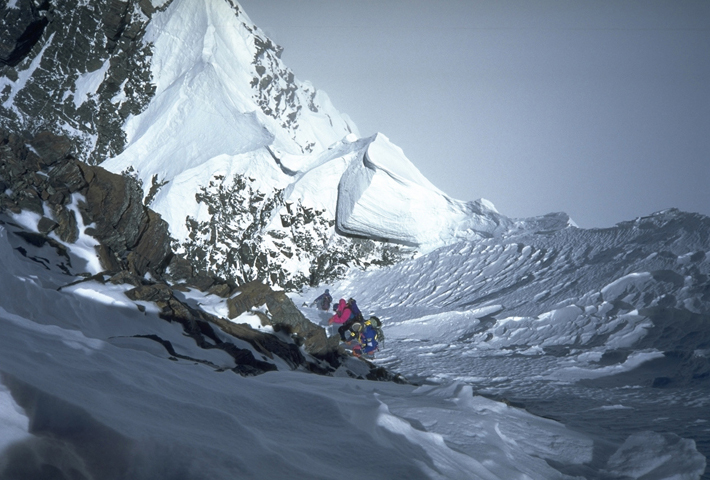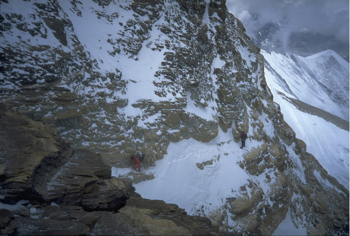 Traversing the snow band directly below Junction Peak(8,400m), toward Camp6.